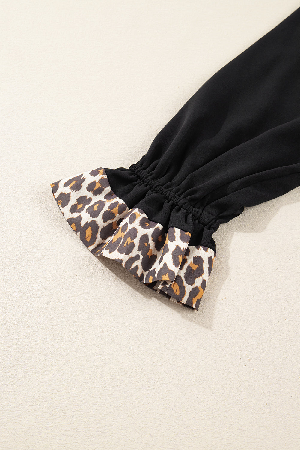 Black Plus Size Notched Neck Leopard Trim Flounce Long Sleeve Shift Dress