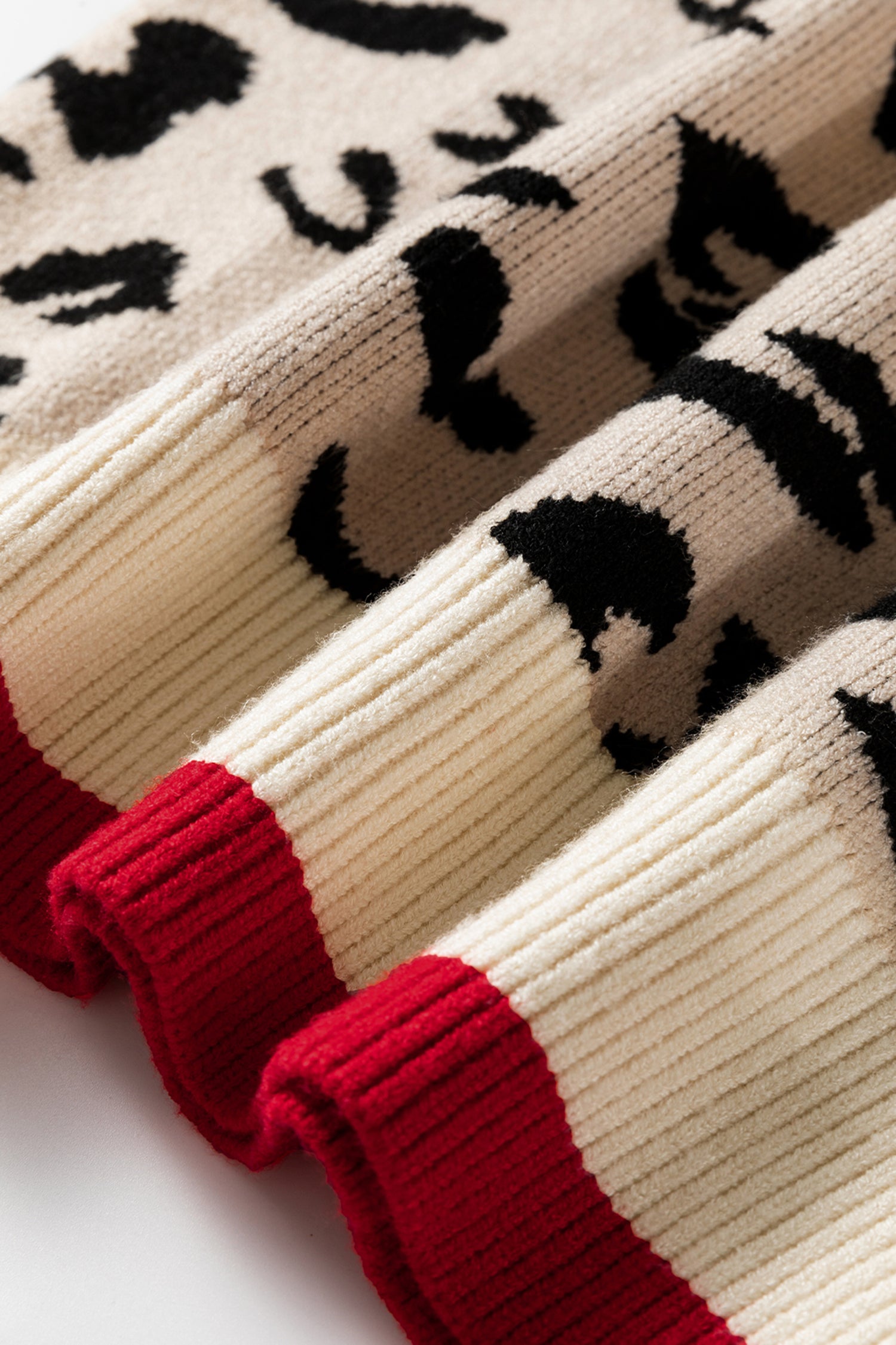 Khaki Leopard Pattern V-Neck Contrast Rib Knitted Sweater