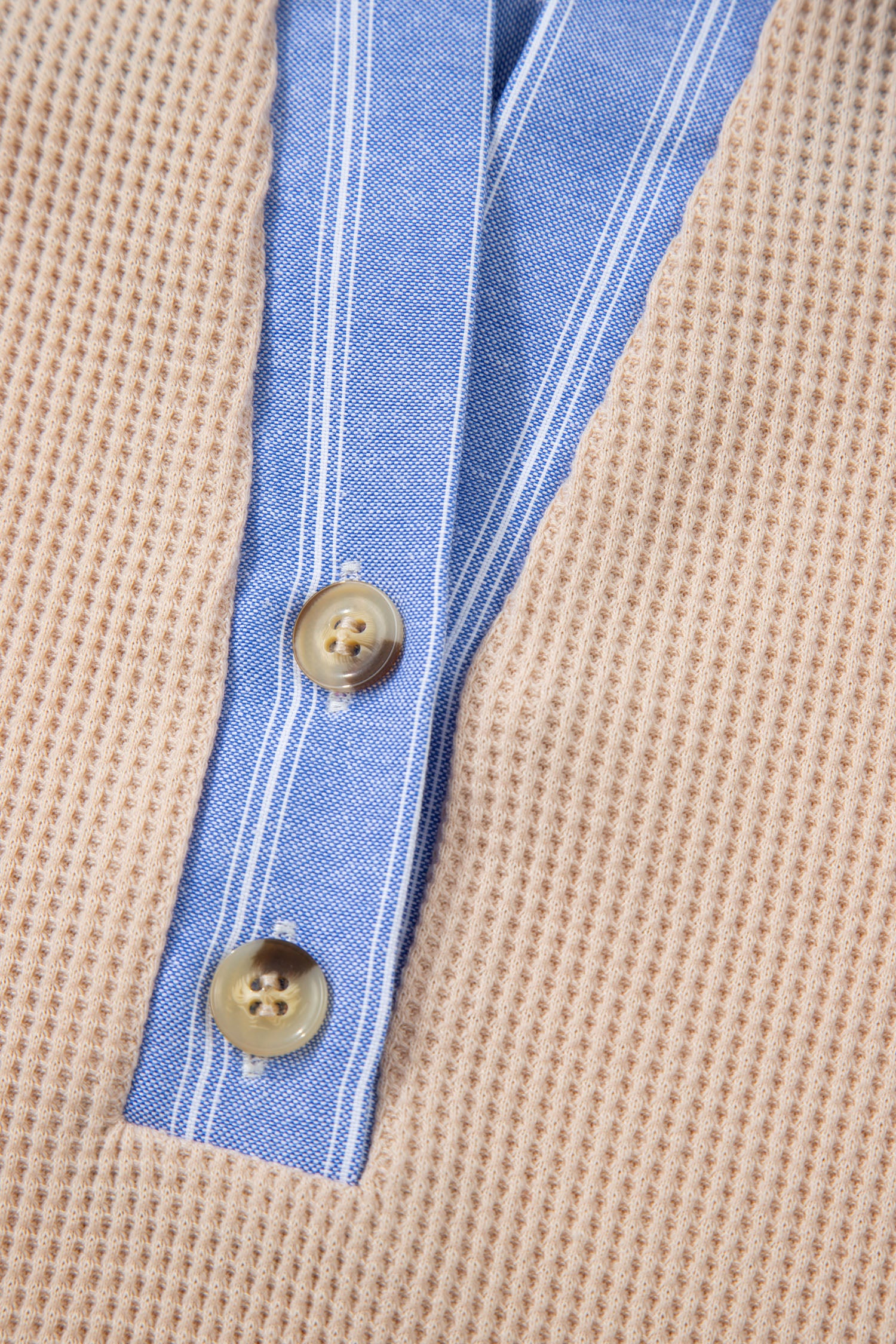 - This plus top showcases a waffle knit body and contrast striped patchwork.
