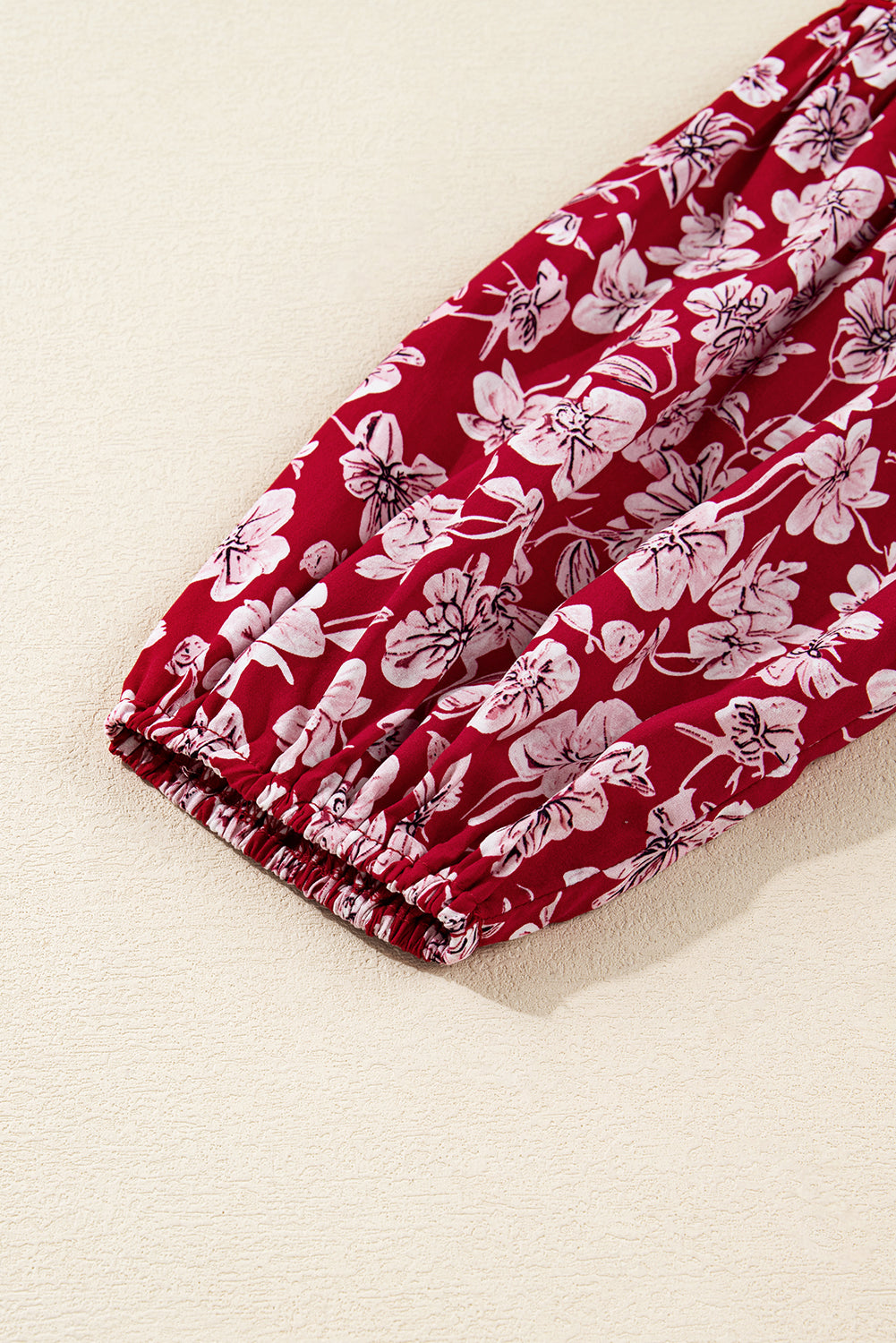 Features a v neck, long puff sleeves, and a ruffled hem.