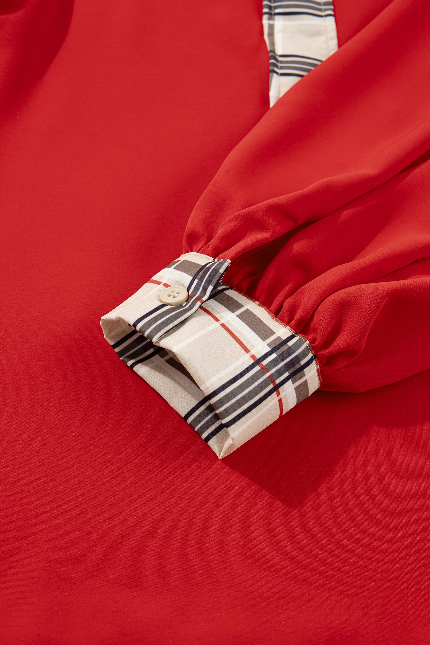 Racing Red Contrast Plaid Patchwork V Neck Long Sleeve Blouse