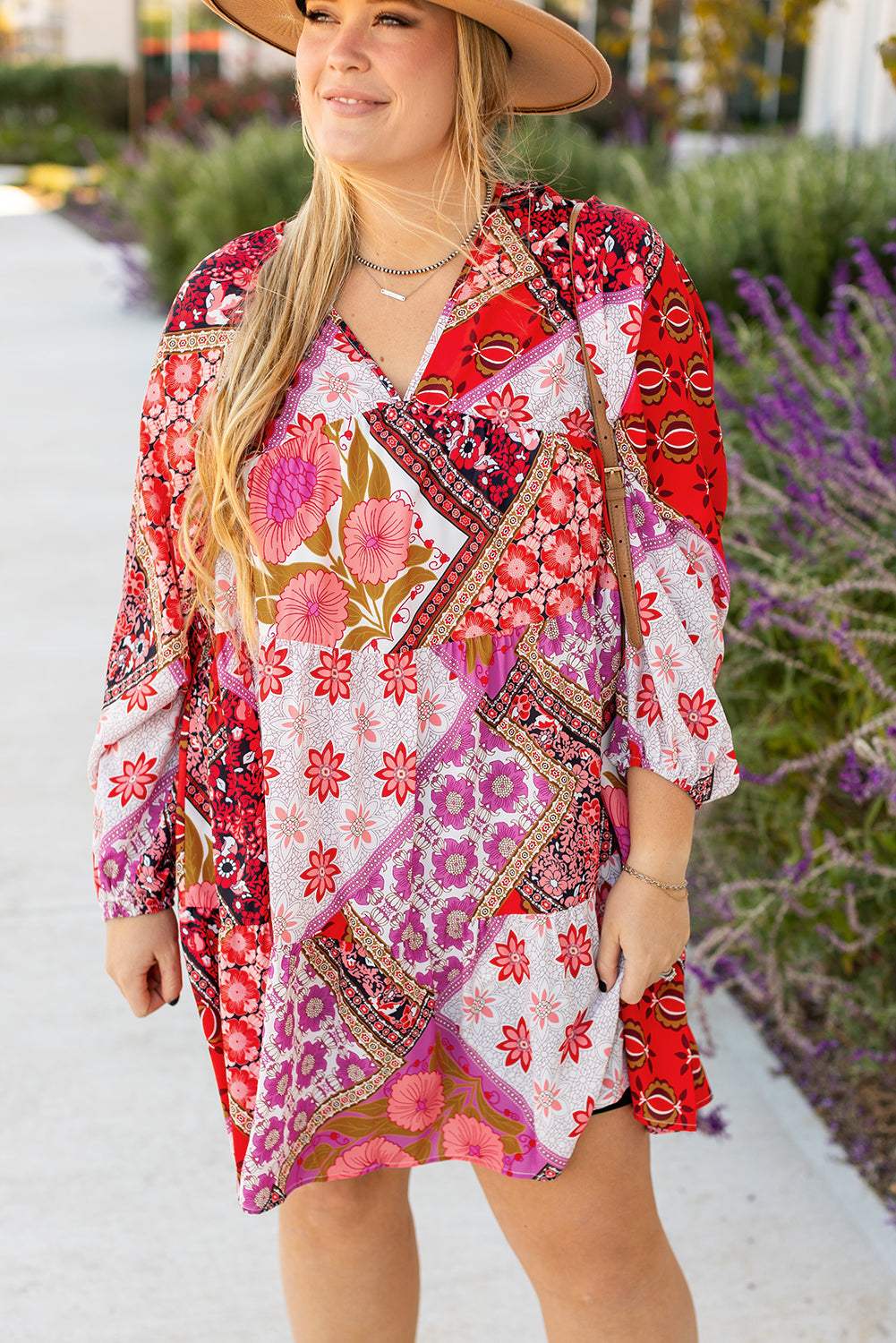 Rose Mixed Floral Long Sleeve V Neck Lace-up Hollowed Back Plus Size Dress