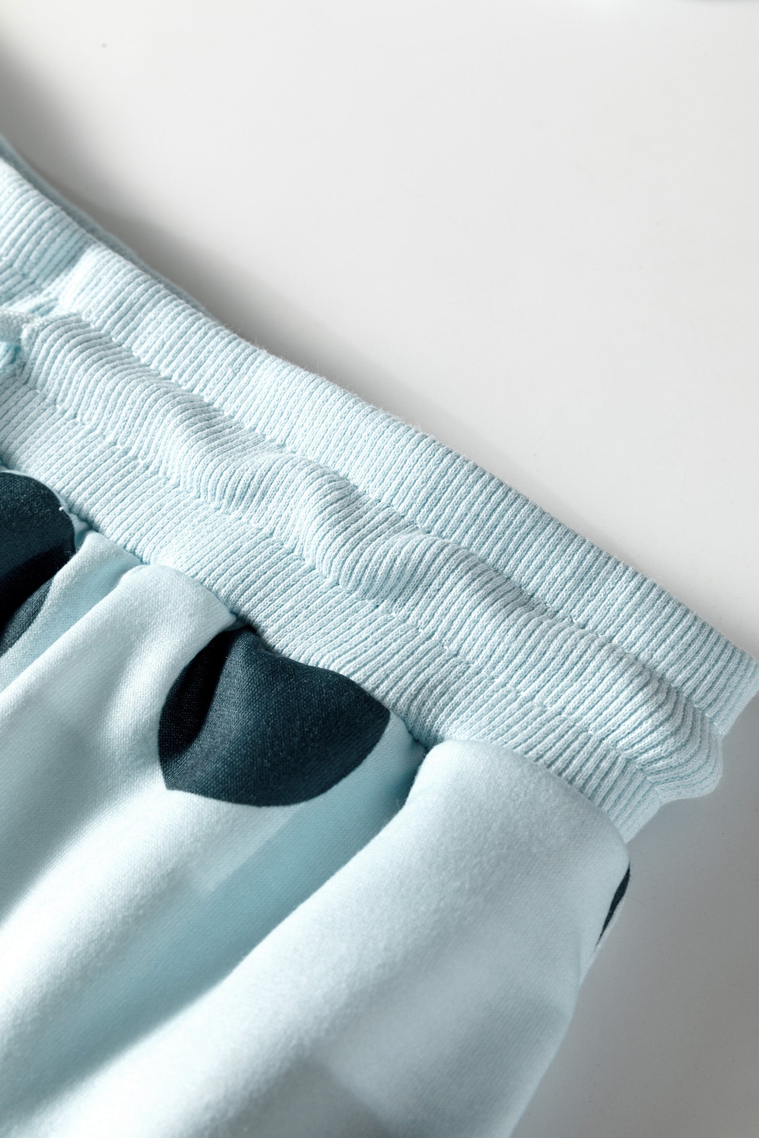 Sky Blue Polka Dot Print Drop Shoulder Pullover Drawstring Shorts Set